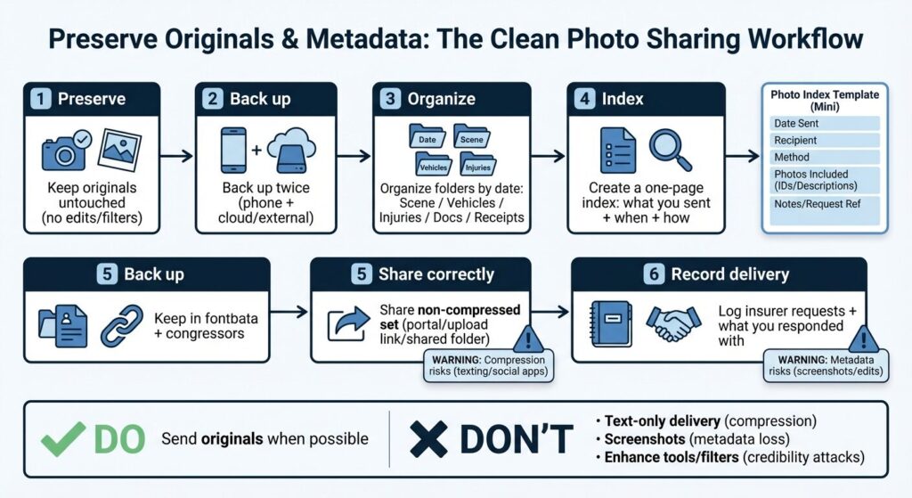 Follow up with the highest-quality originals through the insurer’s upload link or portal if available. Keep a note showing which photos were sent by text and which were later re-sent in full quality.