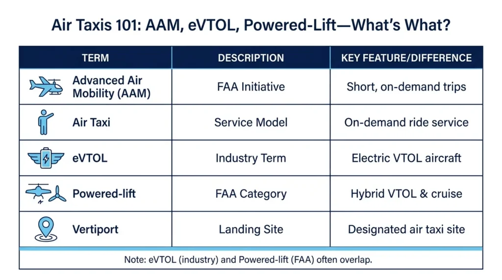 Most air taxi concepts use electric vertical takeoff and landing technology. The industry calls these vehicles “eVTOL.” The FAA calls them “powered-lift.” Both terms often describe the same aircraft.