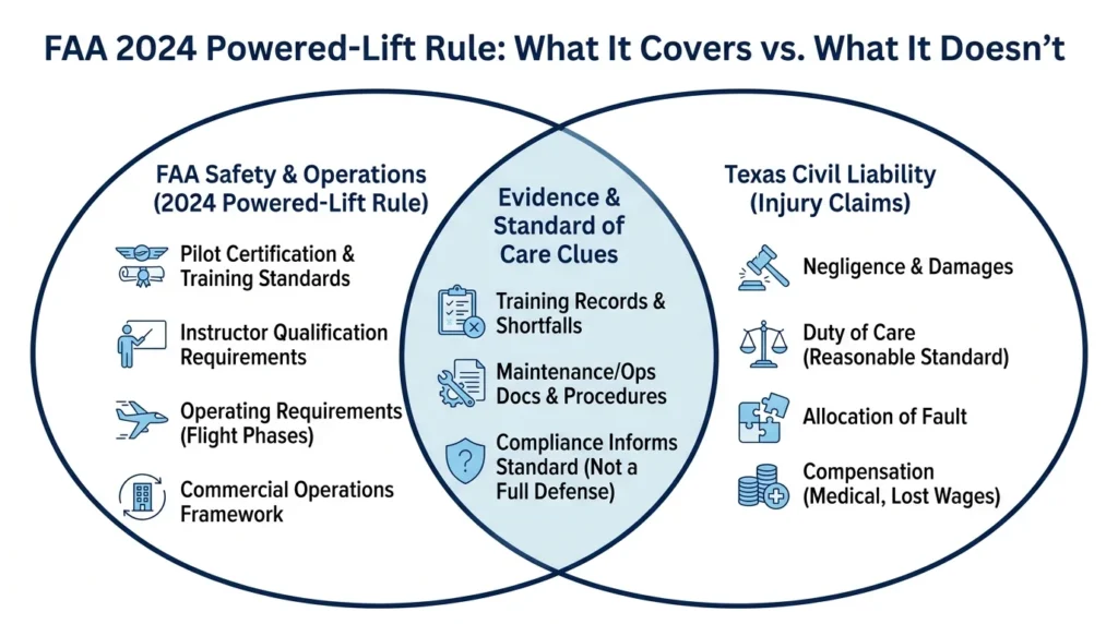 FAA regulations govern safety and operational authorization, not civil liability after an accident. A pilot can be fully FAA-compliant and still be found negligent under Texas law if their conduct fell below the standard of reasonable care. Regulatory compliance is relevant evidence in a lawsuit, but it’s not a complete defense.