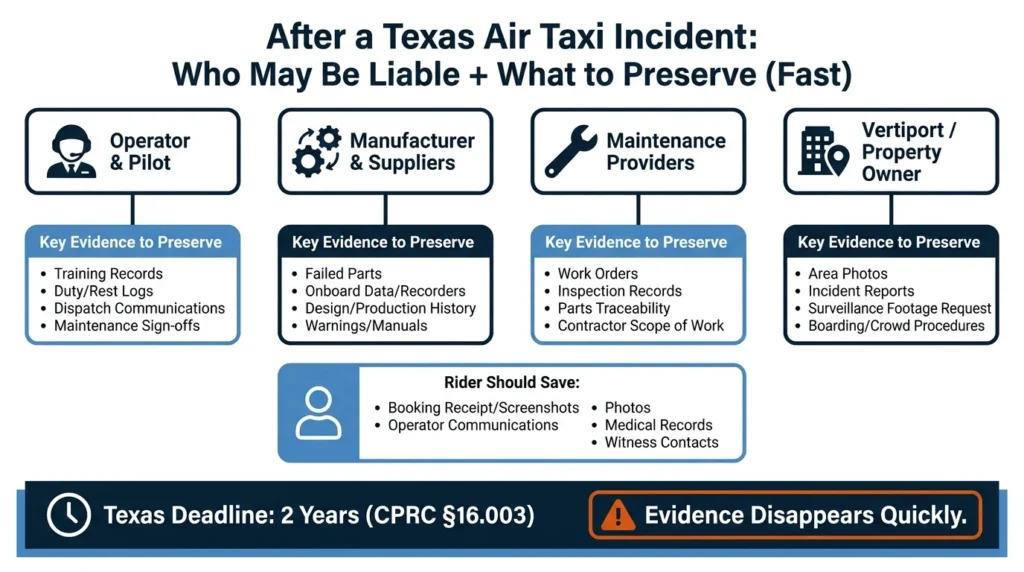 Air taxi accidents can involve multiple potentially liable parties. Identifying all of them early protects your ability to recover full compensation.