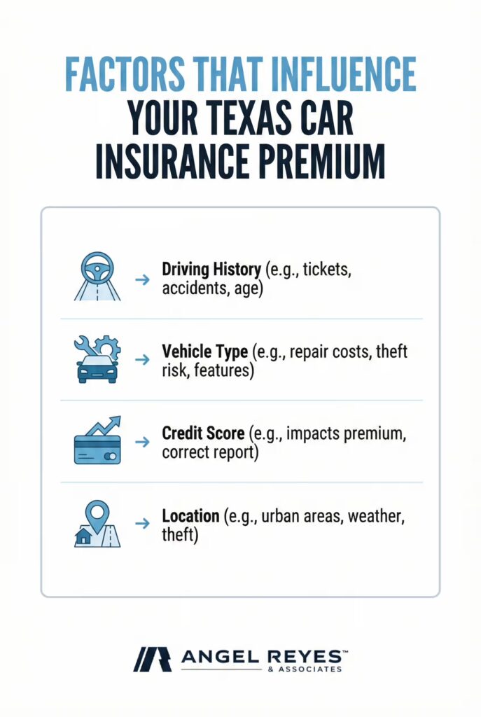 Texas law allows insurers to use credit-based insurance scores when setting rates. A lower score can mean a higher premium, even if your driving record is spotless.