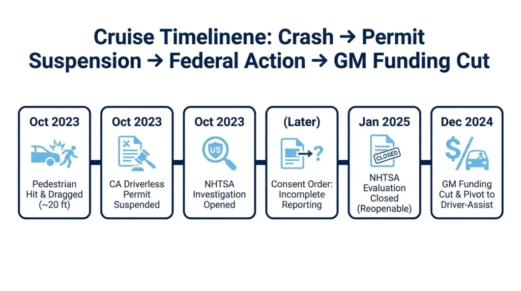 - California suspended Cruise's robotaxi permit after a pedestrian was struck and dragged, followed by federal scrutiny over incomplete crash reporting and GM's decision to stop funding the program entirely.