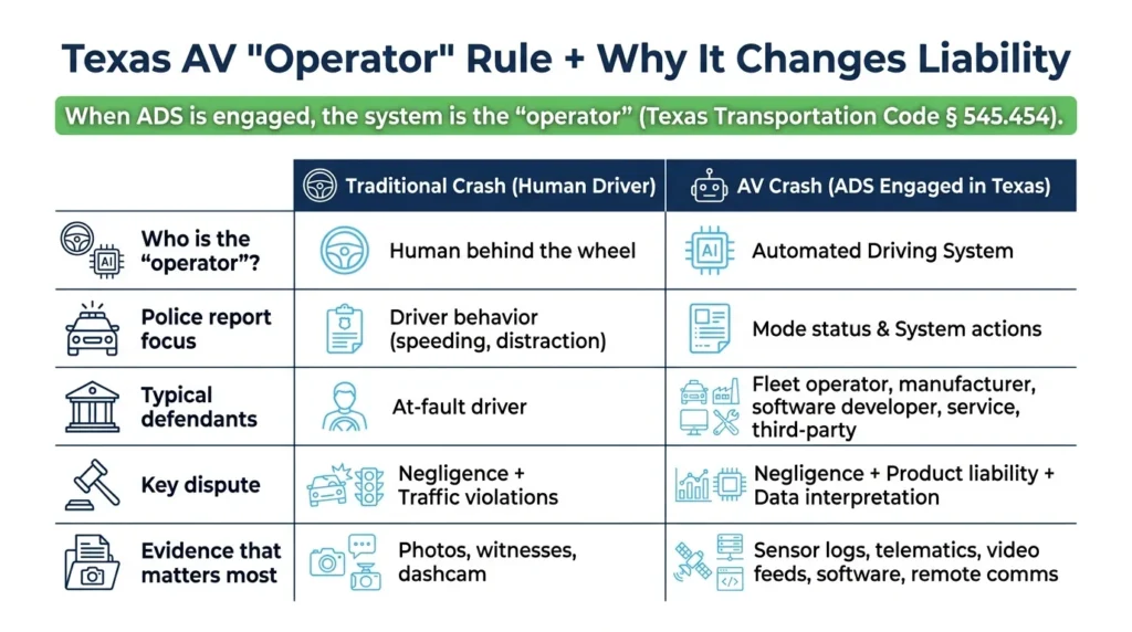 Texas permits automated driving systems under state law. Texas Transportation Code § 545.454 states that when an automated driving system (ADS) is engaged, the system itself is considered to be the “operator” of the vehicle. This creates a unique legal framework that differs from traditional crashes in which a human driver is clearly at fault.
