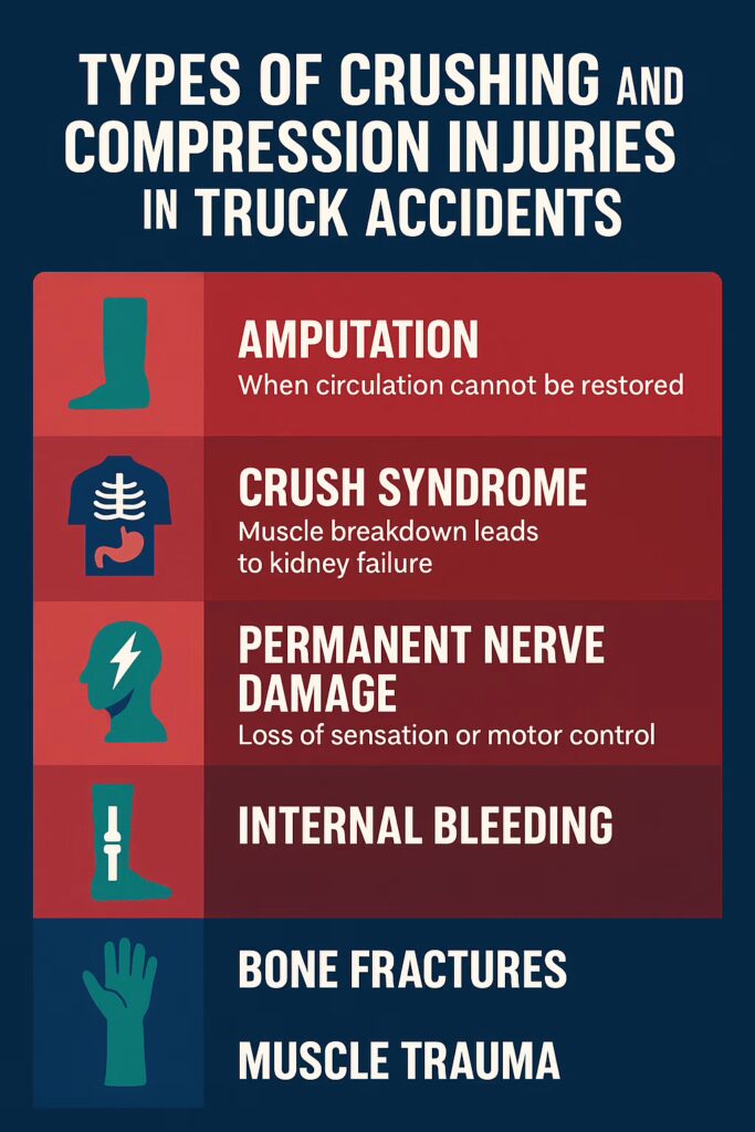 Crushing and compression injuries occur when extreme force from 80,000-pound trucks compresses or traps body parts, causing immediate trauma that often leads to permanent disability.