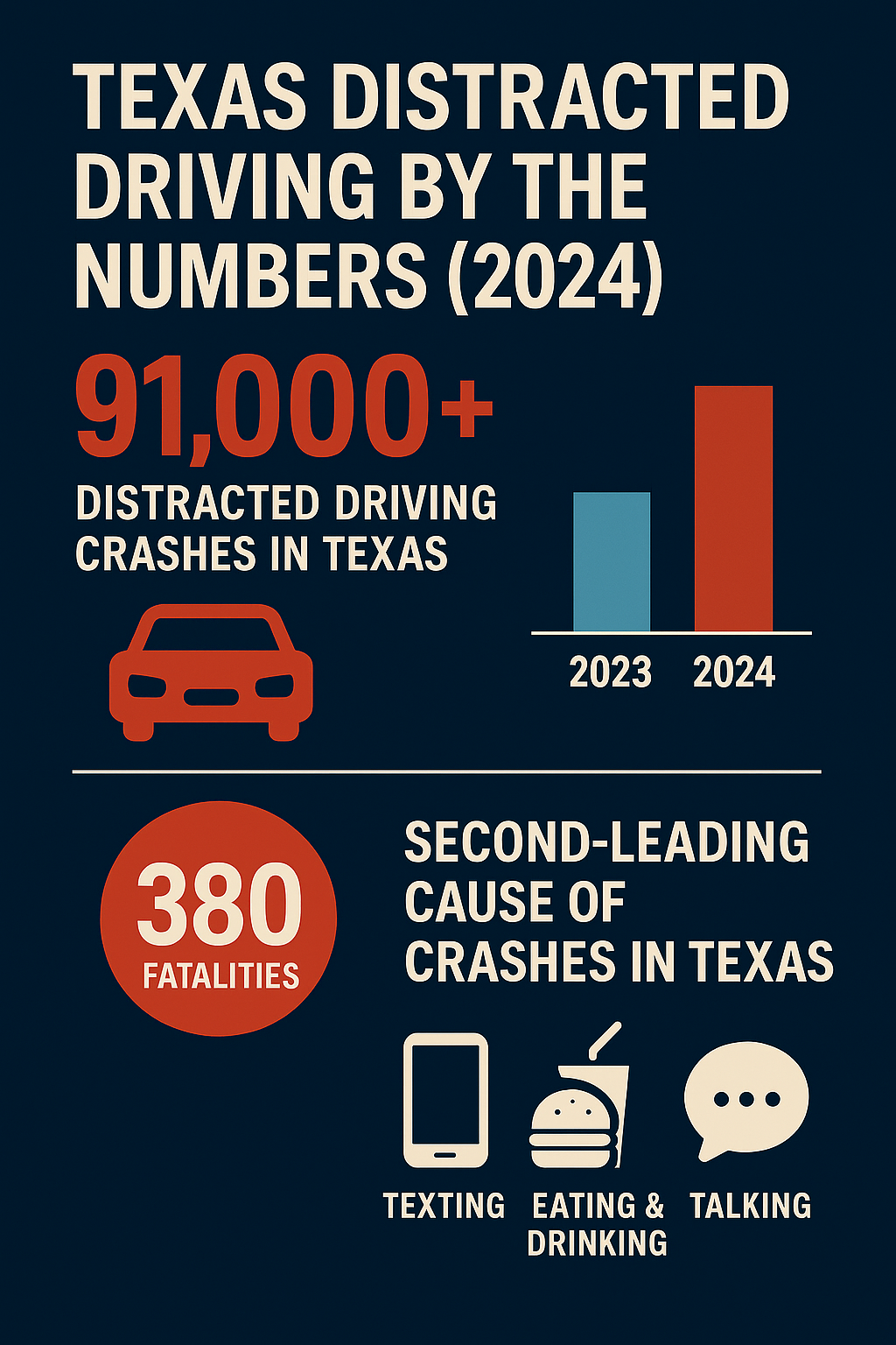 According to the Texas Department of Transportation (TxDOT), distracted driving is now the second-leading cause of crashes statewide. It accounts for over 91,000 accidents and killed 380 people in 2024.