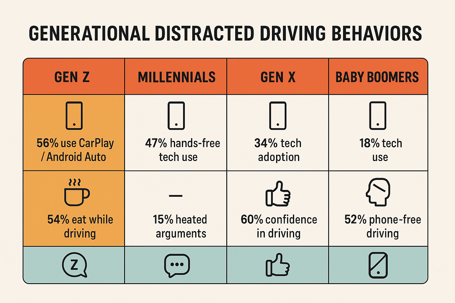 Despite using CarPlay and Android Auto at rates of 56% compared to just 18% of Baby Boomers, Gen Z drivers also exhibit concerning patterns. They show high rates of non-technology distractions.