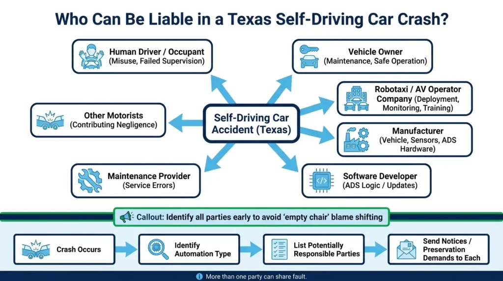 Liability in self-driving vehicle crashes rarely falls on just one party. Your claim may involve multiple defendants with different insurance coverage and legal duties.