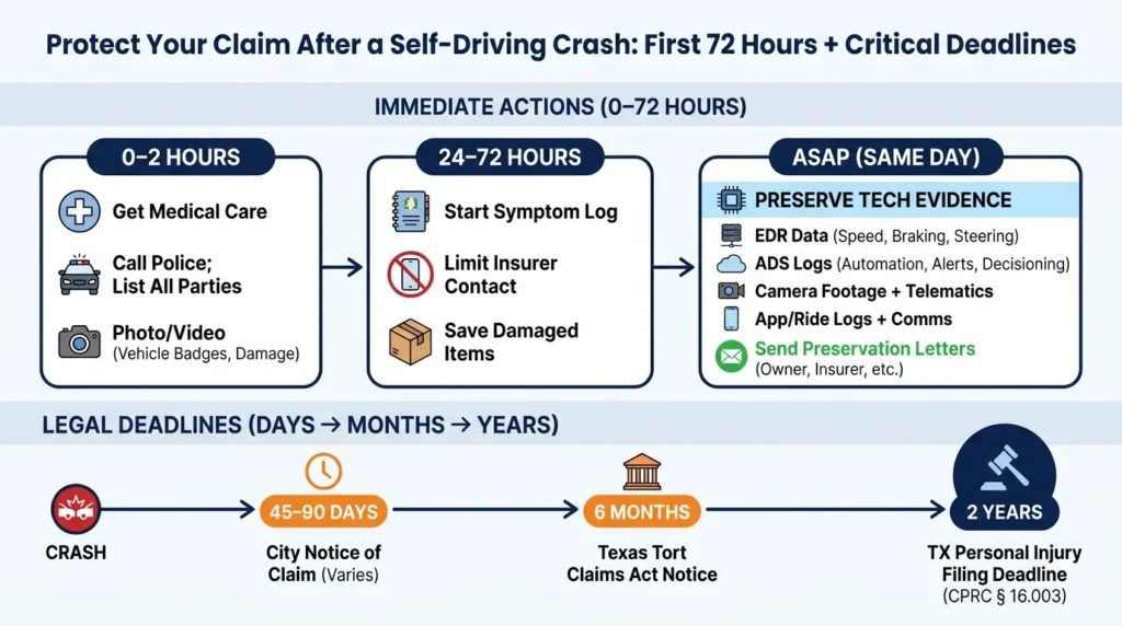 The first 72 hours after a crash involving an autonomous vehicle are critical. The steps you take protect your legal options.