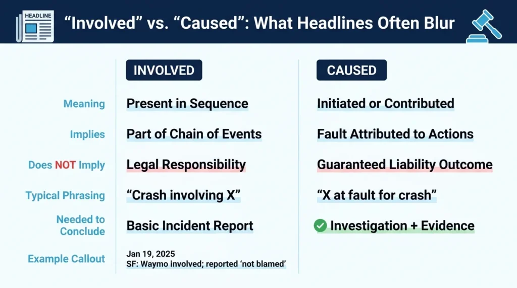 Traffic-law fault, civil liability, and media shorthand are three different things. A police report might assign a citation. A civil lawsuit applies different standards. A headline might simplify everything into language such as “there was a crash involving,” which obscures who did what.