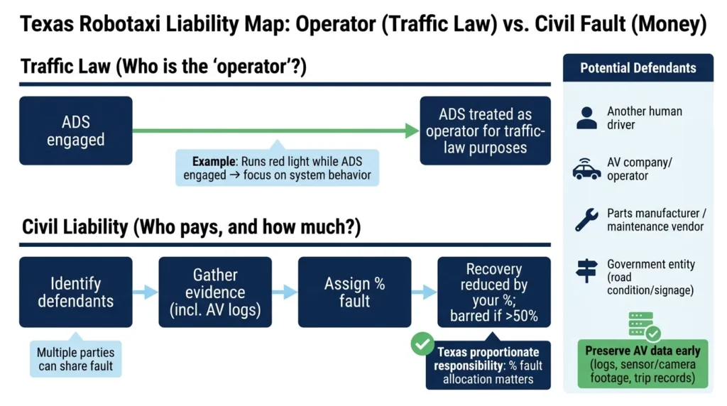 - Texas law treats an engaged automated driving system as the "operator" for traffic-law compliance, which affects how fault is analyzed but doesn't automatically determine civil liability.