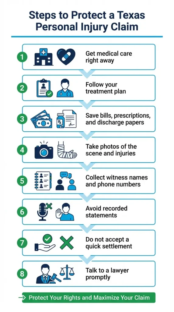 Timing is also an important factor. In many cases, the filing deadline is controlled by Texas Civil Practice and Remedies Code § 16.003, which generally gives you two years to file a personal injury lawsuit. Waiting can make witness statements weaker, video harder to find, and insurer disputes harder to answer.
