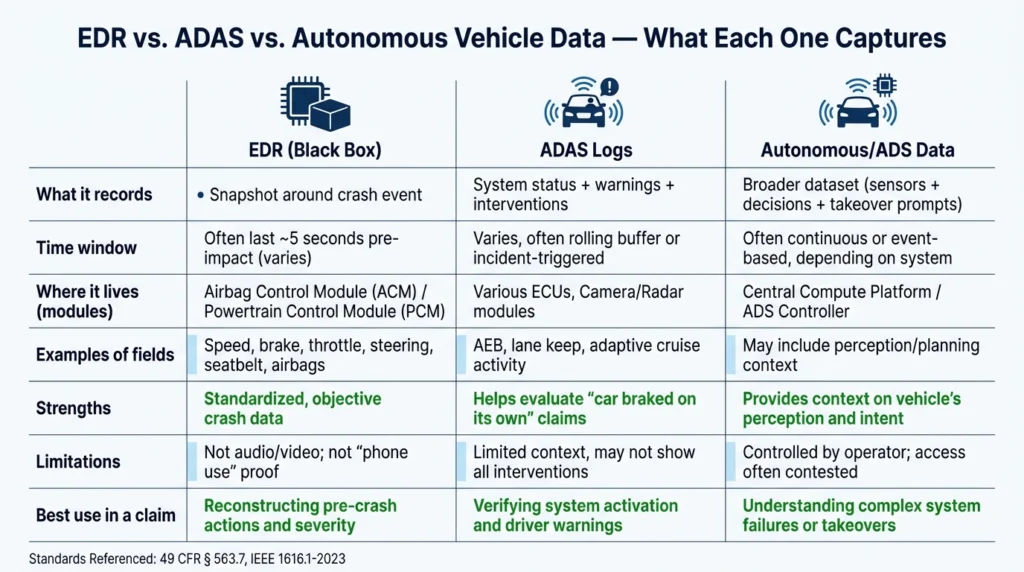 Older vehicles use event data recorders, often called EDRs. These save a short snapshot of data, usually just seconds before and after impact. The information is useful but limited.