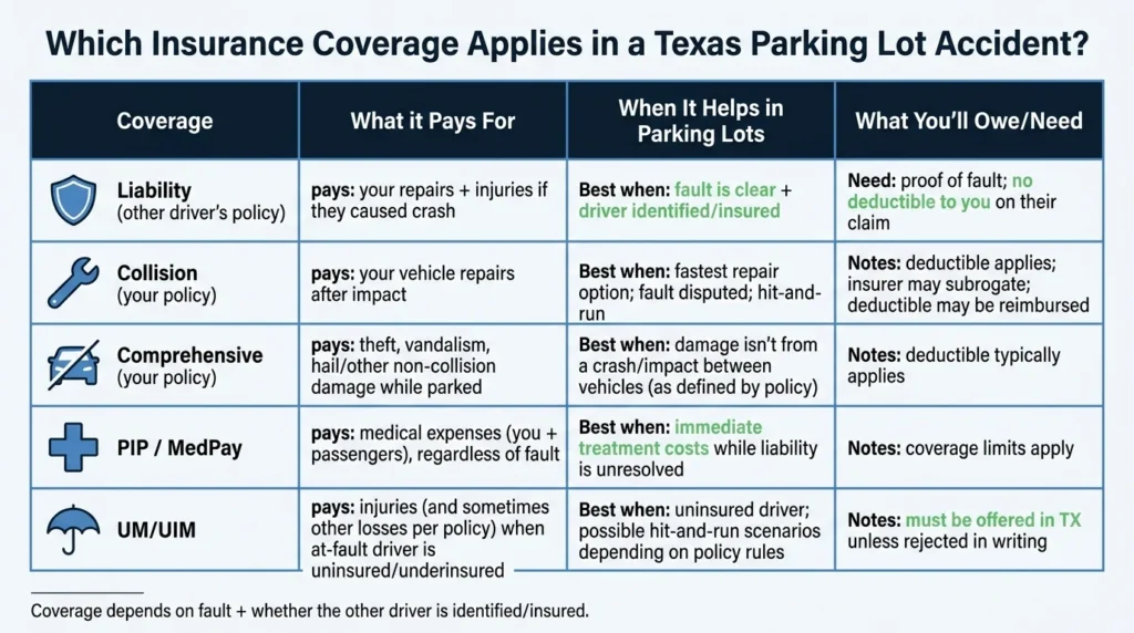 - Texas insurance companies cover parking lot accidents through liability, collision, PIP/MedPay, and UM/UIM coverage.