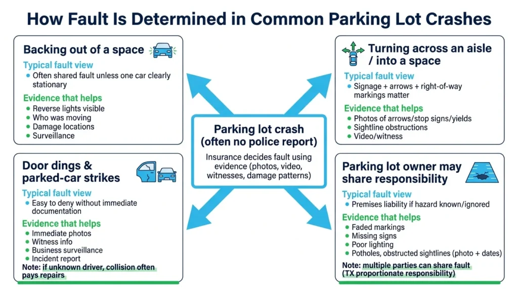 Parking lots produce predictable collision patterns. Understanding how insurers typically view these situations helps you anticipate fault arguments.
