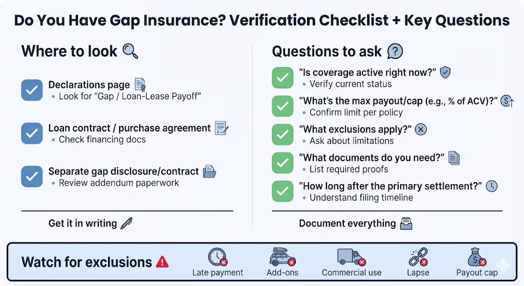 Start with your auto insurance declarations page: look for a line item labeled “gap coverage,” “loan/lease payoff coverage,” or similar. If you don’t see it, call your insurer and ask directly.