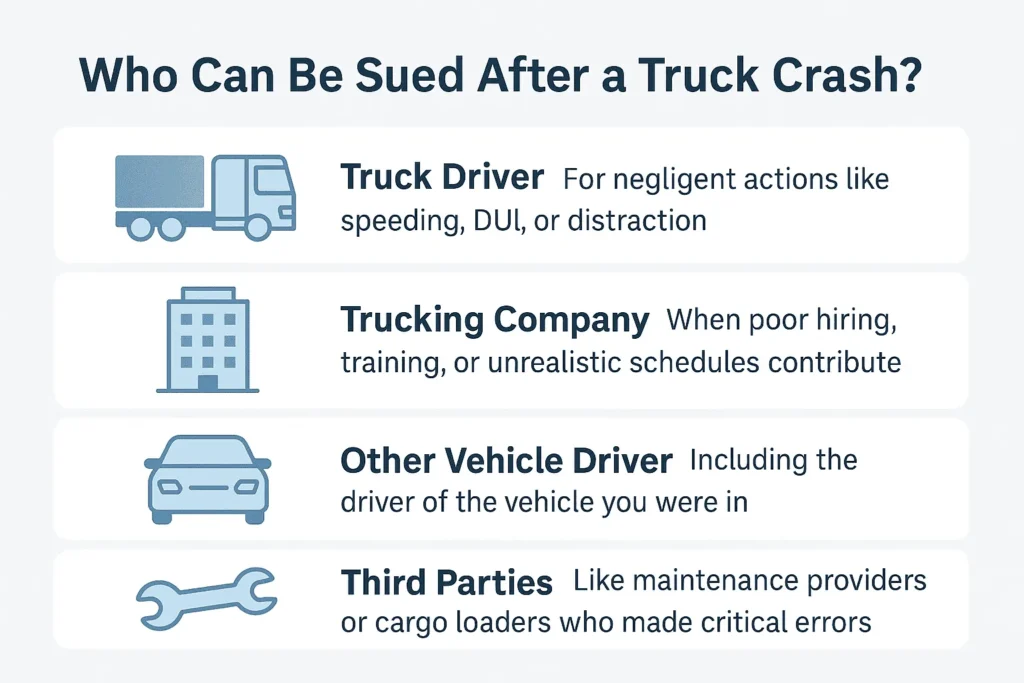 Depending on the truck crash circumstances, multiple parties may share fault: