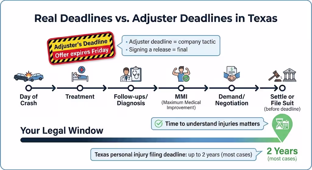 Texas has a two-year statute of limitations for most personal injury claims. Adjuster-imposed deadlines are usually negotiable. Don’t let artificial urgency push you into a decision you’ll regret.