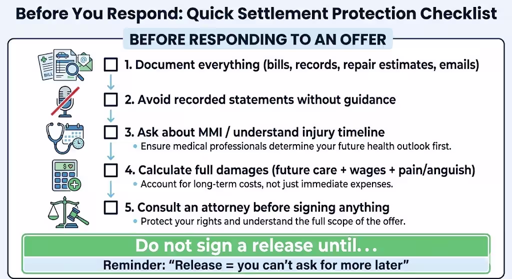 Remember: a signed release is final. You cannot reopen the claim if your condition worsens or new expenses arise. For a deeper look at evaluating offers, see Should I Accept the Insurance Settlement Offer?